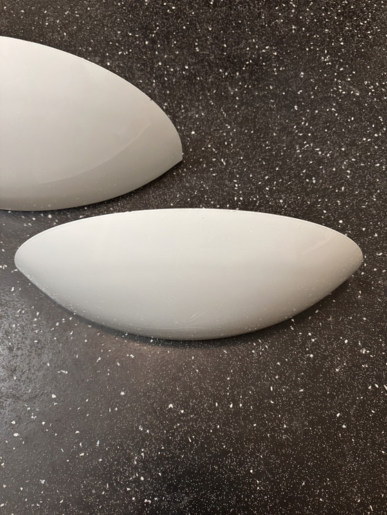 Wunderschönes, großes Paar minimalistischer, halbmondförmiger Wandleuchten aus weiß lackiertem Metall der französischen Marke SCE, Referenz 540927, im Memphis-Stil der 80er/90er Jahre; guter Gesamtzustand (leichte Gebrauchsspuren innen, im Betrieb nicht sichtbar: siehe Fotos); für Standard-Schraubglühbirnen.