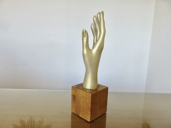 Wunderschöne Hand aus vergoldetem Kunstharz auf einem Holzsockel. Sie stammt aus den 70er Jahren. Höhe 34cm. Sockel 8,5cm x 8,5cm x 8,5cm. In sehr gutem Zustand. Sehr schönes, für die 70er Jahre typisches Dekorationsobjekt.
