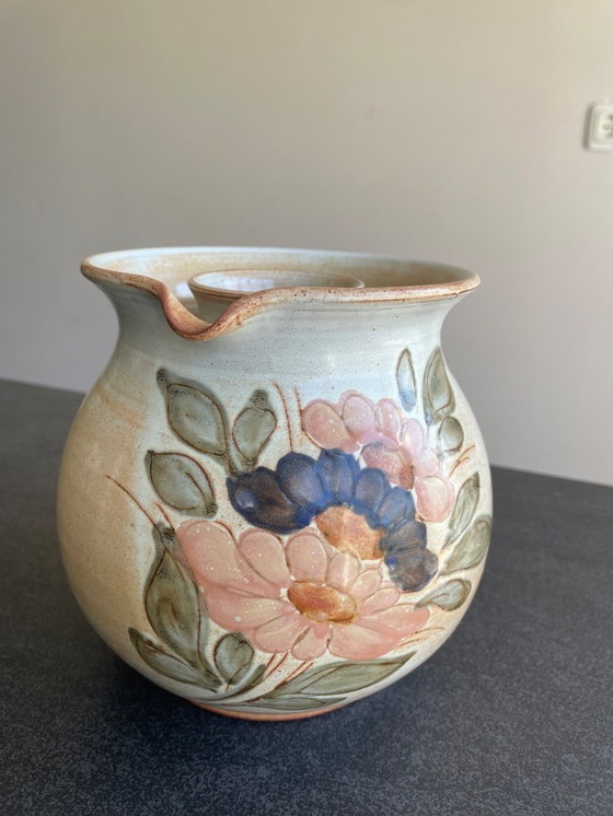 Dieses exquisite, handbemalte Terrakotta-Keramikstück verströmt rustikalen Charme und künstlerische Eleganz. Sein warmer Beigeton wird wunderschön durch zarte florale Motive in Blau-, Rosa- und Grüntönen ergänzt und macht es zu einer perfekten Ergänzung für jede Wohneinrichtung.