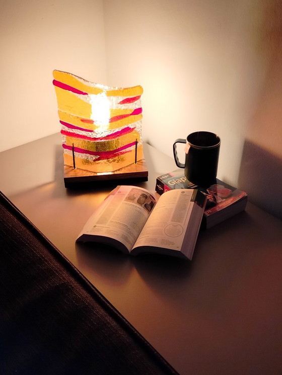 Das Glas besticht durch sanfte Rundungen, strukturierte Transparenz und natürliche Farbvariationen in warmen Bernstein-, Gelb- und Rottönen. Im beleuchteten Zustand erzeugt das durch das Glas fallende Licht tiefe Reflexionen und eine warme, intime Atmosphäre.