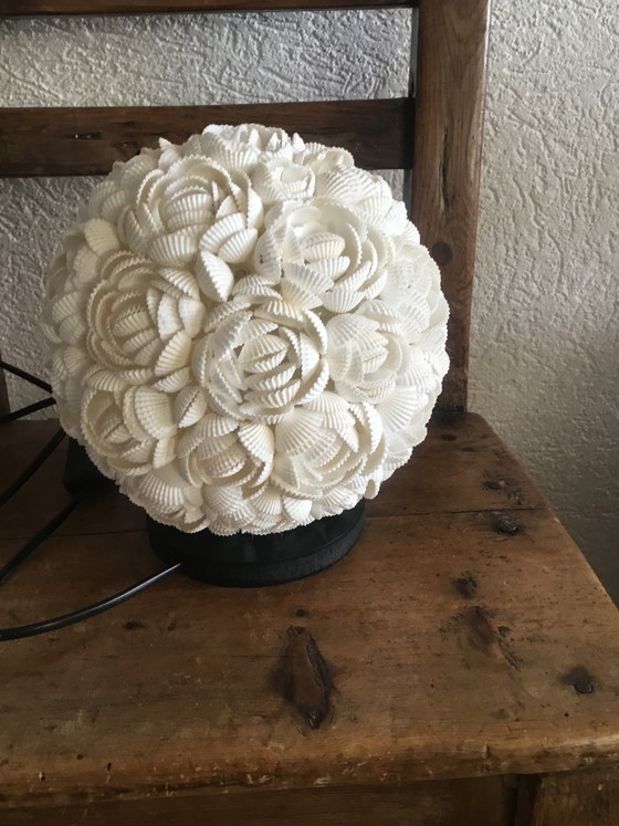 Diese handgefertigte Muschellampe besteht aus weißen Muscheln in Rosenform. Sie steht auf einem runden, schwarzen Holzsockel und hat ein schwarzes Kabel mit Lichtschalter.