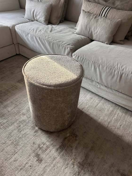 Neuer, handgefertigter Hocker, bezogen mit wunderschönem Chenille-Stoff und verziert mit Paspeln. Es handelt sich um den abgebildeten kleineren Hocker mit einer Höhe von 48 cm und einem Durchmesser von 42 cm. Der Hocker kann als Tisch oder Fußhocker verwendet werden. Ich fertige dieses Stück selbst aus hochwertigen Materialien. Der Hocker besteht aus einem Holzrahmen mit Gurtband, der mit Federbett, Polyurethanschaum und Kaltschaum gepolstert und anschließend bezogen ist. Er ist ein handgefertigtes Unikat, nicht maschinell hergestellt.
