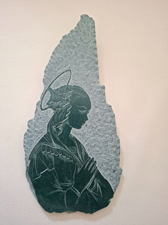 Handgefertigte, gravierte Madonna aus Schiefer. Mit einem Haken auf der Rückseite zur Wandbefestigung.