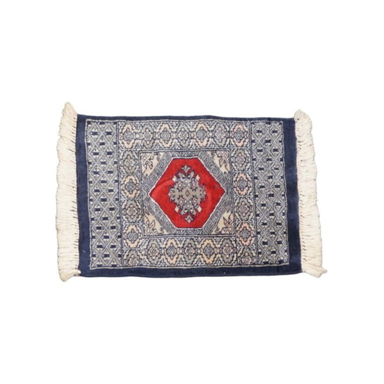 Angeboten wird dieser handgeknüpfte Deko-Teppich/Tischdecke mit einem feinen Muster in dunkelblauen und roten Farben 47x46cm.