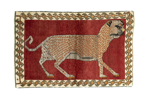 Dieser einzigartige handgeknüpfte Gabbeh Nomadenteppich besticht durch sein ausdrucksstarkes Tiger-Motiv und die warme, traditionelle Farbgebung. Mit einer Größe von 155 x 100 cm eignet er sich ideal als stilvolles Highlight in Wohnräumen oder als Sammlerstück.