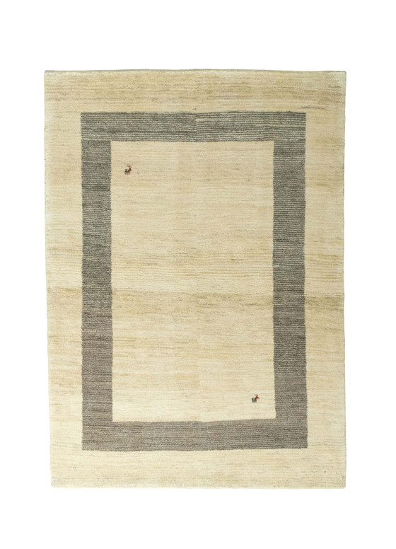 Ein authentischer Gabbeh-Teppich, handgeknüpft von Nomaden, der durch seine schlichte Eleganz und natürliche Farbgebung besticht. Der weiche, beige Grundton mit einem dezent abgesetzten Rahmen in warmem Grau wird von zwei kleinen, symbolischen Tiermotiven durchbrochen – typisch für die Gabbeh-Kunst.