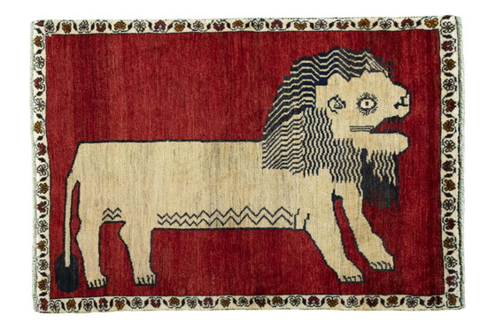 Dieser einzigartige handgeknüpfte Gabbeh Nomadenteppich beeindruckt mit seinem ausdrucksstarken Löwenmotiv, das Kraft, Mut und Schutz symbolisiert. Mit einer Größe von 149 x 102 cm ist er ein faszinierendes Kunstwerk und ein echter Blickfang in jedem Wohnraum.