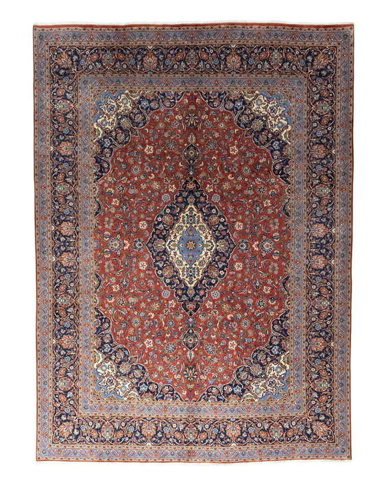 Dieser prächtige Kashan Kork Teppich beeindruckt mit seinem detailreichen Design und den warmen Rottönen, die von tiefblauen und goldenen Akzenten ergänzt werden. Mit einer Größe von 403 x 292 cm ist er ein majestätischer Blickfang für große Wohnräume. Die feine Korkwolle sorgt für eine besonders weiche und luxuriöse Haptik.