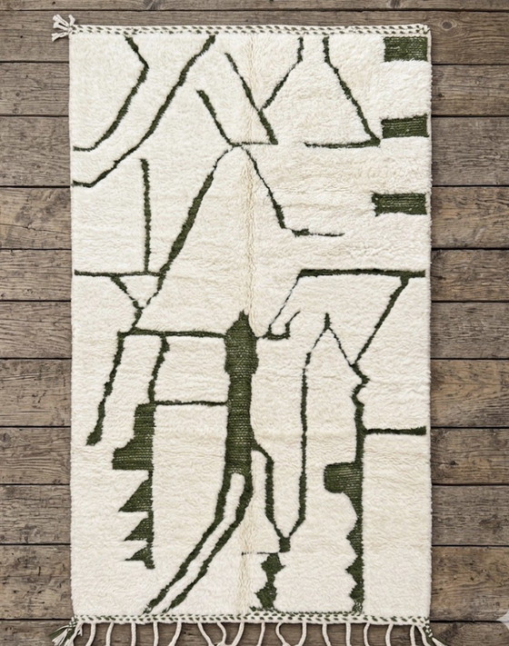 Dieser wunderschöne, handgeknüpfte Berberteppich vereint traditionelle Handwerkskunst mit einem markanten, modernen Linienspiel in Grün. Eine warme Bereicherung für skandinavische oder industriell gestaltete Interieurs.