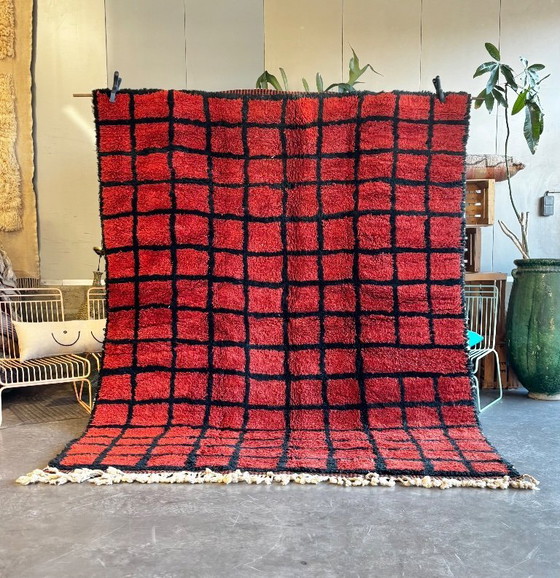 Dieses Exemplar besticht durch ein tiefes Ziegelrot, das von einem markanten schwarzen geometrischen Gittermuster akzentuiert wird und so einen kraftvollen und zugleich harmonischen visuellen Rhythmus erzeugt. Die grafische Komposition verleiht diesem Teppich eine moderne, architektonische Note, ohne dabei die tiefen Wurzeln der Berber-Webtradition zu verleugnen. Seine satte Farbpalette verleiht jedem Interieur Wärme, Charakter und Tiefe. Der handgeknüpfte Teppich aus 100 % natürlicher Schafwolle bietet einen dichten, flauschigen Flor und fühlt sich unglaublich weich an. Die Wolle wird sorgfältig aufgrund ihrer Festigkeit und ihrer natürlichen Isolierfähigkeit ausgewählt, wodurch der Teppich sowohl optisch ansprechend als auch äußerst funktional für den Alltag ist.