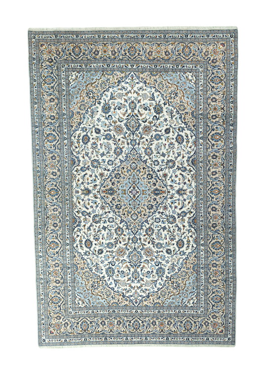 Ein prachtvoller, in traditioneller Handarbeit gefertigter Kashan Kork Teppich, der durch sein elegantes florales Medaillon-Design, seine feine Detailtiefe und den dezenten Seidenglanz beeindruckt. Die zarten Blau-, Elfenbein- und Beigetöne verleihen ihm eine edle Ausstrahlung – ein zeitloses Schmuckstück für anspruchsvolle Wohnräume.