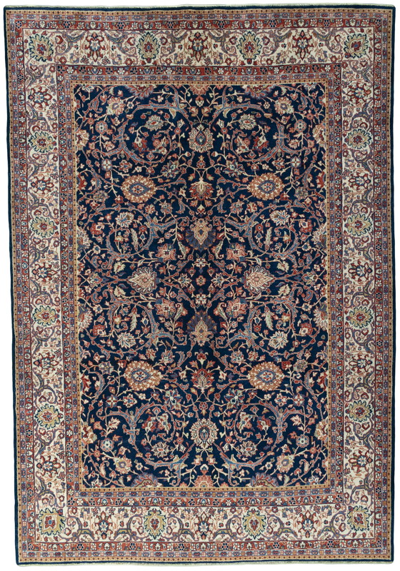 Dieser prachtvolle Sarough Orientteppich besticht durch seine klassische Eleganz und fein ausgearbeiteten floralen Muster. Der tiefblaue Fond bildet einen edlen Kontrast zu den zarten Elfenbein-, Rot- und Grünnuancen des aufwendig gestalteten Blumenornaments.