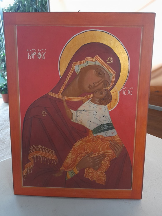 Diese prächtige Ikone Unserer Lieben Frau der Zärtlichkeit ist ein Kunstwerk, das Spiritualität und Schönheit ausstrahlt. Handgemalt auf einer Holztafel, fängt diese Ikone die Essenz mütterlicher Zärtlichkeit mit exquisiten Details und leuchtenden Farben ein.