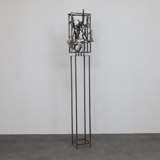 Die Zeit hat den Charakter dieses Werkes maßgeblich geprägt. Die Oberfläche hat eine reiche, natürliche Patina entwickelt, die den industriellen Ursprung des Stahls abmildert und Tiefe, Wärme und Materialauthentizität verleiht. Die hohen, schlanken Proportionen verleihen der Skulptur eine totemartige Präsenz und lassen sie den Raum mit stiller Autorität statt Monumentalität einnehmen.
