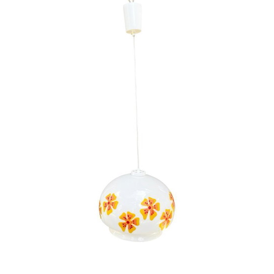 Der Lampenschirm in Form einer großen Halbkugel besteht aus weißem Glas, das mit handgemalten floralen Motiven in Orange- und Rottönen verziert ist. Die markante Oberfläche des Lampenschirms ist mit satinierter Farbe überzogen, wodurch ein zarter "Wildleder"-Effekt entsteht, der den einzigartigen Charakter der Lampe noch unterstreicht.
