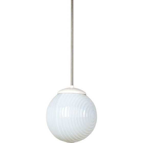 Tschechoslowakische Pendelleuchte aus Glas aus den 1970er Jahren, mit Kunststoff- und Metallteilen. Mit einem einzigartigen, strukturierten Glasschirm: ideal für Esstische oder als Stimmungslicht.MK8970