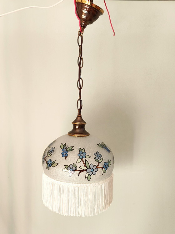 Oben befindet sich eine Messingaufhängung, die mit einem Kabel und einer Kette verbunden ist, die am Ende mit einer Abdeckung für die Lampenfassung und einem kleinen Ring zur Befestigung an der Decke versehen ist.