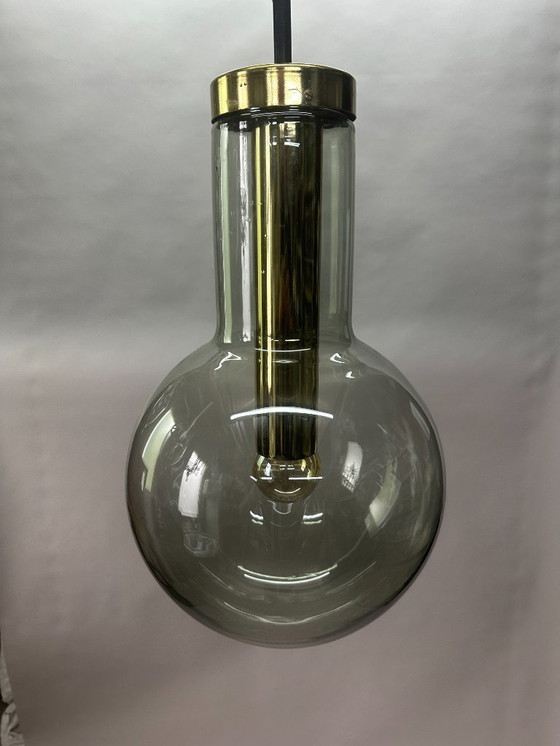 Eine seltene Raak Maxi Globe Pendelleuchte aus den 1970er Jahren, gefertigt aus Rauchglas mit Messingdetails. Dieses ikonische niederländische Designobjekt ist mit seiner skulpturalen Form und seinem warmen Licht ein absoluter Blickfang.