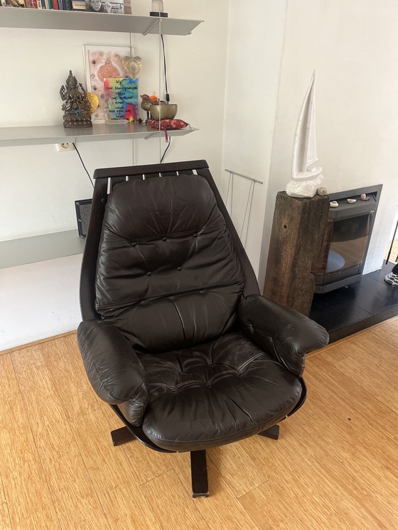 Dieser Hans Brattrud-Drehstuhl von Hove Mobler ist ein beeindruckendes Beispiel für Mid Century Modernes Design. Aus einer Kombination von braunem Holz und luxuriösem braunem Leder gefertigt, bietet er sowohl Stil als auch Komfort. Das ergonomische Design und die Drehfunktion machen den Stuhl zu einer perfekten Ergänzung für jeden Wohnbereich oder jedes Büro. Die zeitlose Ästhetik und die hochwertigen Materialien sorgen dafür, dass der Stuhl über Jahre hinweg geschätzt wird.