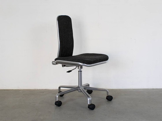 Seltener Hille Supporto Bürostuhl, ein authentisches Exemplar des ehemaligen Hille-Fabrikdesigns von Fred Scott. Aus poliertem Aluminium mit neuer grauer Polsterung, höhen- und rückenverstellbar. B 55 cm, T 55 cm, H 88/98 cm, Sitzhöhe verstellbar 46/56 cm.