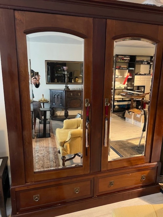 Hoher antiker Mahagonischrank mit geschliffenen Spiegeln