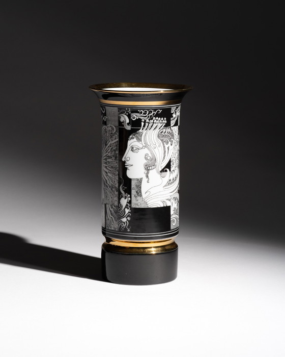 Eine markante und elegante Porzellanvase von Hollóháza Porzellan, einer der ältesten und renommiertesten Manufakturen Ungarns (gegründet 1777). Dieses hohe, zylindrische Stück zeugt von der für die Manufaktur so typischen Meisterschaft in Bezug auf feine Linienführung, grafische Illustration und luxuriöse Vergoldung – ein Markenzeichen des Hollóháza-Designs des späten 20. Jahrhunderts.