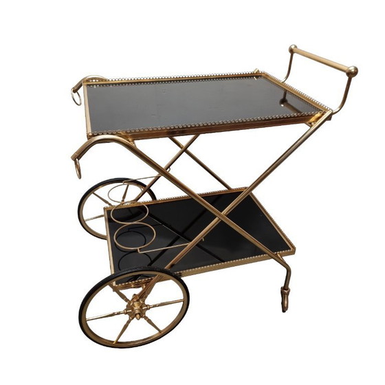 Dieser französische Servierwagen im Stil der Hollywood Regency ist ein stilvolles und luxuriöses Möbelstück aus Oktober 1971. Er ist aus poliertem Messing gefertigt und verfügt über zwei Ablagen aus schwarzem Plexiglas. Dieses Exemplar ist mit „Breveté SGDG – Modèle Déposé“ und dem Registrierungsdatum 6. September 1971 gekennzeichnet. Guter Zustand.