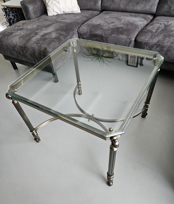 Messinggestell mit dicker Glasplatte mit abgeschrägter Kante.