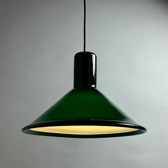 Coole und stilvolle grüne Hängeleuchte aus dickem Glas vom dänischen Designer Michael Bang für Holmegaard. Dieses Modell heißt P & T PENDEL und wurde im Jahr 1972 entworfen. Hochwertiges dickes Opalglas, gibt ein sehr angenehmes Licht. Holmegaard spezialisierte sich auf mundgeblasenes Glas und war damals der Spitzenreiter auf dem Markt. Ich habe 2 Leuchten auf Lager
