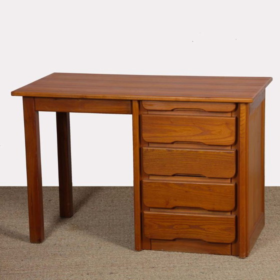 Dieser Schreibtisch aus Holz wurde in den 1980er Jahren von Hafele herausgegeben. Er lässt sich über eine Reihe von vier Schubladen öffnen, die sich auf der rechten Seite befinden. Das Gestell ist aus Ulmenholz. Der Tisch ist in einem guten Vintage-Zustand. Die Tischplatte ist restauriert.