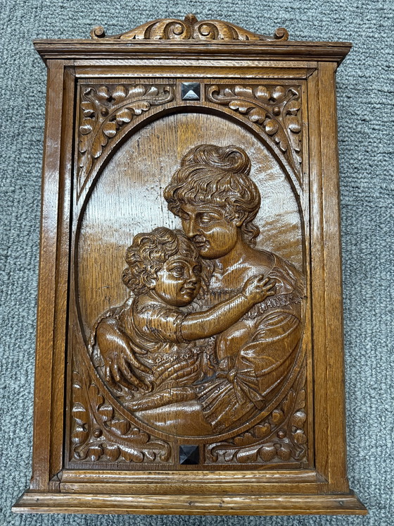 Diese exquisite Holztafel zeigt eine aufwändig geschnitzte Darstellung eines zärtlichen Moments zwischen einer Mutter und ihrem Kind. Die Handwerkskunst zeigt sich in den detaillierten Ausdrücken und fließenden Linien, die diese klassische Szene zum Leben erwecken. Dieses Stück eignet sich perfekt, um jedem Raum einen Hauch von zeitloser Eleganz zu verleihen, und ist ein Beweis für die Kunst der traditionellen Holzschnitzerei.
