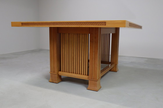 Esstisch Husser 615, entworfen von Frank Lloyd Wright im Jahr 1899 für das "Husser-Haus" in Chicago. Das "Husser-Haus" wurde ebenfalls von Frank Lloyd Wright für Helen und Joseph Husser entworfen. Der Tisch wurde 1992 von Cassina überarbeitet und in die Kollektion "Cassina I Maestri" aufgenommen und wird nicht mehr hergestellt. Der Tisch ist aus natürlichem Kirschbaumholz gefertigt. Signiert und nummeriert! Abmessungen: 127x74x153 cm