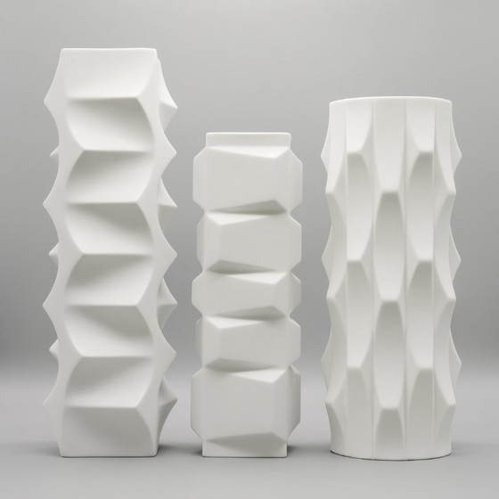 Tauchen Sie ein in die raffinierte Welt des deutschen Porzellans der Mitte des 20. Jahrhunderts mit diesem exquisiten Trio von „ARCHAIS“-Vasen, entworfen von Heinrich Fuchs für Lorenz Hutschenreuther. Die zwischen Ende der 1960er und Anfang der 1970er Jahre gefertigten skulpturalen Stücke verkörpern die Verbindung von traditioneller Handwerkskunst und avantgardistischem Design – Porzellan neu geboren als reine Form.