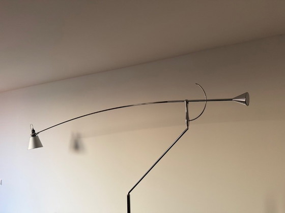 Stehleuchte Hydra, entworfen von Carlo Forcolini für Nemo. Verchromte Stehleuchte mit einem Arm aus Kohlefaser. Der Arm ist drehbar. Höhe: 200 cm, Armlänge: 175 cm.