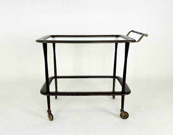 Vintage Servierwagen aus Mahagoni, Glas und Messing im Stil von Cesare Lacca, in exzellentem Zustand (siehe Fotos). Die Messingteile weisen eine Patina auf, die auf Wunsch entfernt werden kann. Lieferung in Mailand und Umgebung möglich.