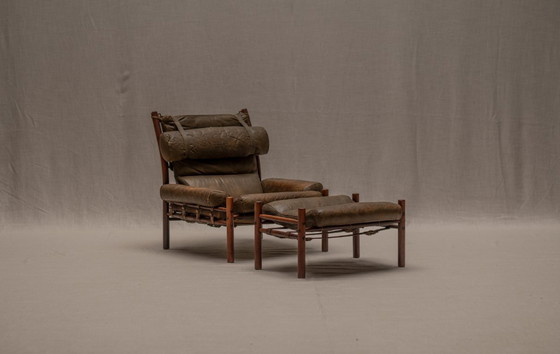 Seltenes Safari-Sessel-Set Modell 'Inca' komplett mit Original-Ottomane. Entworfen von Arne Norell - für Norell Möbel AB Aneby. Schöne und seltene Originalausgabe in olivgrünem Leder kombiniert mit einem massiven Holzrahmen. Im allgemeinen guten Vintage-Zustand mit einer einzigartigen Patinierung des Leders, die dem Set ein Gefühl von Geschichte und Charakter verleiht.