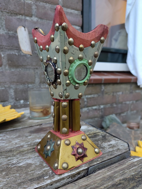 ZustandGutFarbenGold, Rot, GrünMaterialHolz, MetallAnzahl der Artikel1Höhe22 cmBreite10 cmTiefe10 cmGebrauchsspurenRost, Kratzer