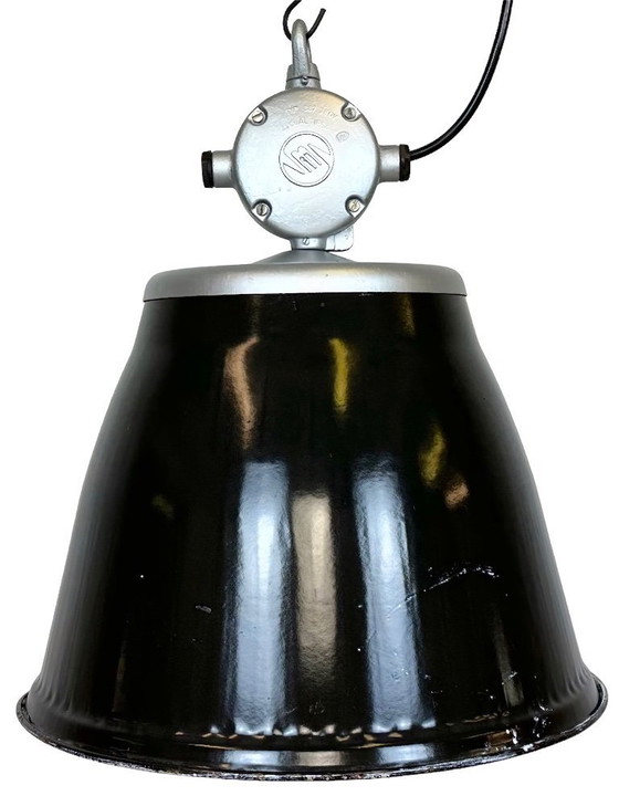 Industrial enamel hanging lamp made by Elektrosvit in former Czechoslovakia during the 1960s. It features a cast aluminium top newly painted on silver and a black enamel shade with white interior. New porcelain socket requires standard E 27/ E 26 light bulbs. New wire. The lamp weighs 4 kg. The lampshade diameter is 43 cm.