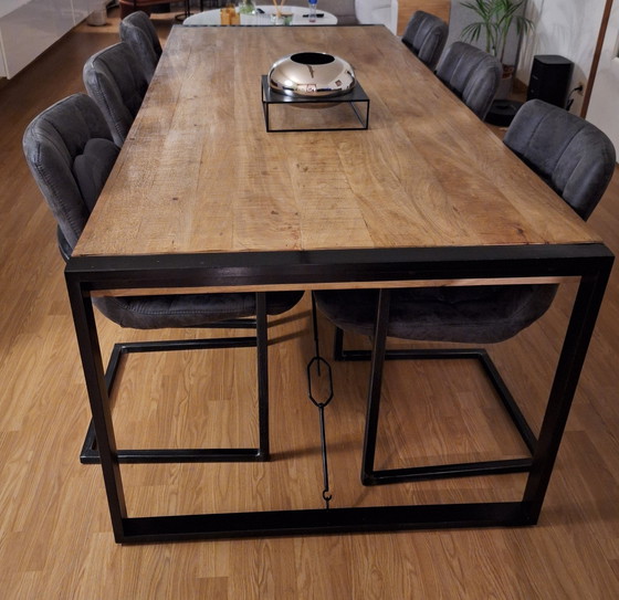 Industrielle Esszimmergarnitur mit 6 Armlehnenstühlen Tisch 2m20 x 1m leichte Beschädigung am Bein Stühle graues Leder und gebürstete schwarze Metallbeine Sitzhöhe 48 cm Rückenhöhe 88 cm Armlehnenhöhe ab Boden 64 cm Die Esszimmergarnitur ist 2 Jahre alt und in sehr gutem Zustand Neupreis war 2433 € Angebotspreis ist 1100€