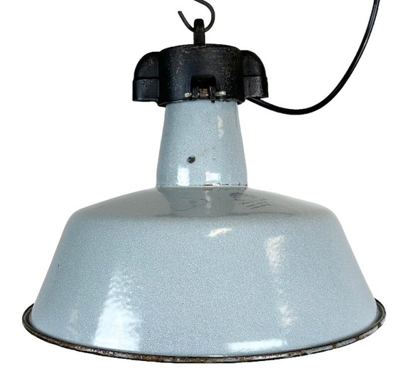 Industrielle Fabriklampe aus grauem Emaille mit gusseisernem Aufsatz, 1960er Jahre