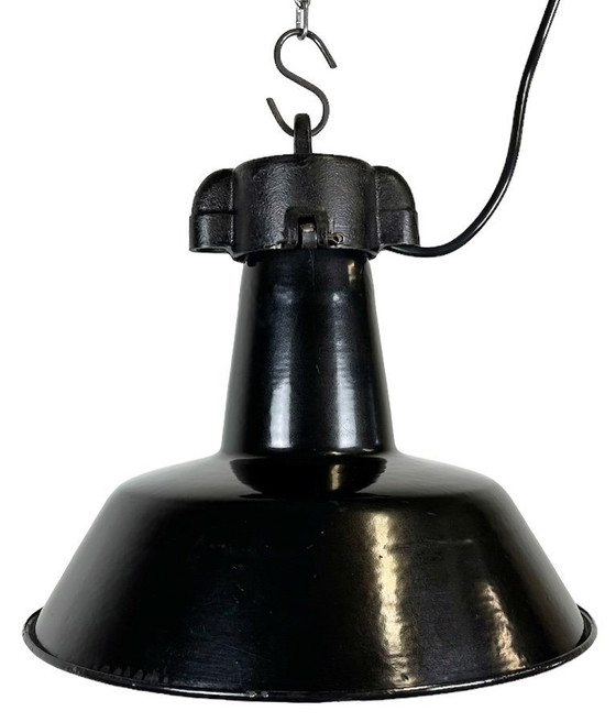 Industrielle Pendelleuchte aus schwarzer Emaille, hergestellt in der ehemaligen Tschechoslowakei in den 1960er Jahren. Weiß emaillierter Schirm innen. Gusseiserner Lampenschirm. Die Porzellanfassung benötigt E27/E26-Leuchtmittel. Neues Kabel. Voll funktionsfähig. Gewicht: 1,5 kg.