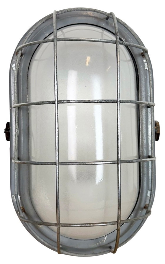 Diese industrielle Wandleuchte wurde in den 1970er Jahren von Elektrosvit in der ehemaligen Tschechoslowakei hergestellt. Sie verfügt über einen grauen Metallkörper, eine Milchglasabdeckung und ein Eisengitter. Die Fassung benötigt Standard-Glühbirnen vom Typ E27/E26. Neues Kabel. Das Gewicht der Lampe beträgt 1,9 kg.