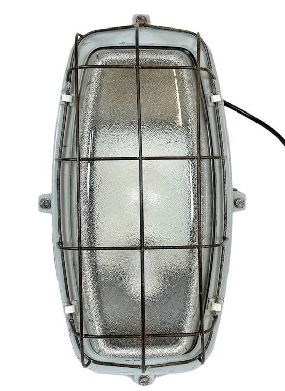 Industrielle Wandleuchte, hergestellt von Elektrosvit in der ehemaligen Tschechoslowakei in den 1980er Jahren. Sie besteht aus einem Aluminiumgussgehäuse, mattiertem Glas und einem Stahlgitter. Die Porzellanfassung benötigt E27-Leuchtmittel. Neues Kabel. Die Lampe wiegt 4 kg und kann auch als Deckenleuchte verwendet werden.