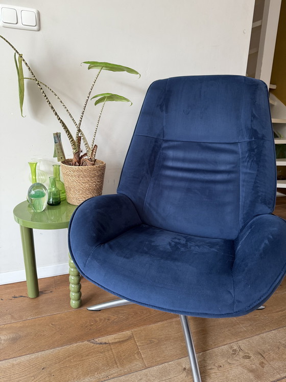 Dieser stilvolle Irabo-Drehsessel von Ruijter Möbel ist eine schöne Ergänzung für jede moderne Einrichtung. Der Sessel ist mit dem Stoff Sedana 49 in einer eleganten Marinefarbe gepolstert und hat eine glatte Rückenlehne mit schlichten Nähten. Das verchromte Gestell sorgt für einen festen und stabilen Stand, während der Drehmechanismus für zusätzlichen Komfort und Flexibilität sorgt. Mit den Maßen 72x84x102 cm passt dieser Sessel perfekt in Wohn- und Büroräume. Trotz einiger sichtbarer Flecken ist der Sessel in einem sehr guten Zustand und bietet ein bequemes Sitzerlebnis.