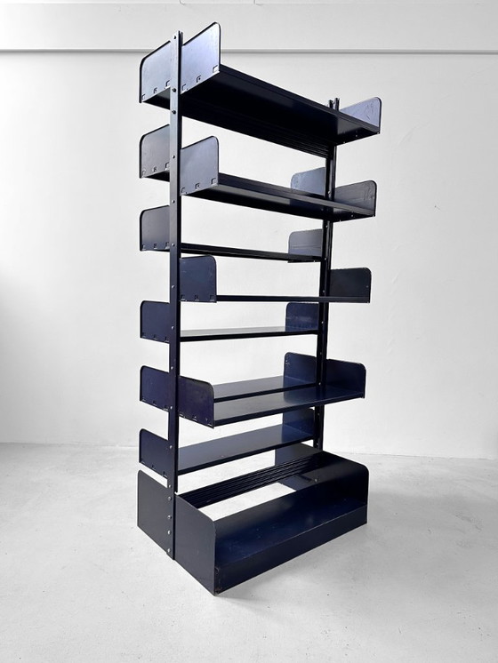 Doppelregal „Congresso“ von Lips Vago. Stahlblau lackierter Stahl, Italien, 1960er Jahre. Mit verstellbaren Einlegeböden.