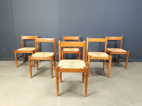 Vintage-Esszimmerstühle aus Eiche und Geflecht, stark inspiriert von den Carimate-Esszimmerstühlen von Vico Magistretti.