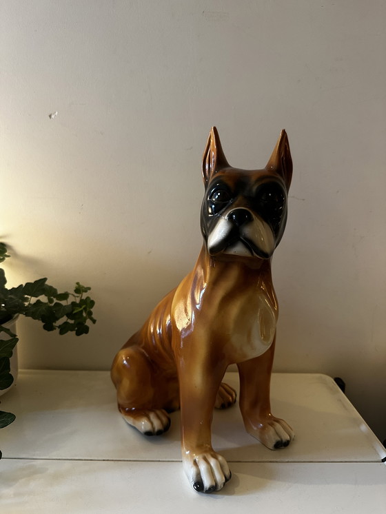 Ein robuster, charaktervoller Vintage-Keramikhund in Boxerform. Mit seinem muskulösen Körper, der gefleckten Schnauze und den ausdrucksstarken Augen ist er ein echter Hingucker. Wunderschöne, glänzende Glasur in warmen Braun-Schwarztönen. In einem schönen Vintage-Zustand mit einer kleinen Ohrspitze (siehe Foto).