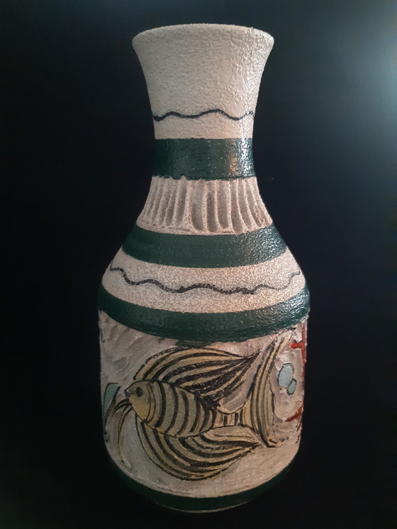 Diese sehr schöne Sgraffito-Vase (eine Dekorationsmethode, bei der Figuren oder Muster in den noch feuchten Ton geritzt werden) aus Keramik wurde in der Fabrik der berühmten italienischen Keramiker Fratelli Fanciullacci hergestellt. Die Familie Fanciullacci unternahm ihre ersten Schritte in der Keramikindustrie bereits 1737 bei Richard-Ginori, einem in diesem Jahr gegründeten weltberühmten Porzellanhersteller. Die Vase hat eine Höhe von etwa 25 cm und einen Durchmesser von etwa 12 cm. Die Vase weist 2 kleine, fast nicht sichtbare Restaurierungen von Chips am Hals auf. Die Vase wurde mit hellen, weichen Farbtönen dekoriert, um Fantasie-Meerestiere darzustellen. Die Vase stammt höchstwahrscheinlich aus den 1950er Jahren. Sie ist ein besonders schönes, seltenes und begehrtes Stück. Das Design stammt höchstwahrscheinlich von Aldo Londi, der besser bekannt ist als kreativer Leiter des berühmten Keramikstudios der Familie Bitossi, eine Position, die er rund 50 Jahre lang innehatte. Aldo Londi begann seine Karriere bereits im Alter von 11 Jahren, als er als Lehrling in die Fabrik Fratelli Fanciullacci eintrat. Dass die Gebrüder Fanciullacci ein Händchen für das Geschäft hatten und ihre Fabrik zu einem der größten Arbeitgeber der Region ausbauen konnten, zeigt sich an mehreren Dingen. Im Jahr 1911 wurde die Fabrik auf die andere Seite des Arno verlegt. Schließlich war hier eine neue Eisenbahnlinie gebaut worden, die der Fabrik einen perfekten Zugang zum Transport ihrer Produkte zu in- und ausländischen Kunden (Amerika war einer ihrer größten ausländischen Kunden) ermöglichte. In dieser Zeit verlagerten die Gebrüder Fanciullacci ihre Tätigkeit auch immer mehr von der einfachen Haushaltskeramik zur Kunstkeramik und reagierten auch eifrig auf die sich ständig ändernden Modetrends im Keramiksektor, was zu starken Unterschieden im Stil der Werke führte. Dies und die Tatsache, dass viele der Werke nicht signiert waren, macht es heute schwierig, die Keramikkunstwerke der Fabrik als solche zu erkennen (glücklicherweise trägt diese Vase die Marke und Modellnummer "Italy F1"). Am Ende des Zweiten Weltkriegs (als Aldo Londi lange Zeit in Kriegsgefangenschaft war) hatte die Muttergesellschaft Colorificio Bitossi die Fabrik Fratelli Fanciullacci übernommen (die Brüder Franciullacci blieben dort aktiv). Aldo Londi kehrte zurück und wurde Kreativdirektor bei Bitossi. Daher ist es mehr als wahrscheinlich, dass er auch Einfluss auf die künstlerische Ausrichtung der Fanciullacci-Fabrik hatte. Leider fiel die Fabrik am 4. November 1966 einer Überschwemmung des Arno zum Opfer, wodurch die meisten Dokumente verloren gingen, so dass es keine absolute Gewissheit darüber gibt. Der Vergleich des Werks von Fratelli Fanciullacci mit diesem von Bitossi deutet jedoch stark in diese Richtung. All dies macht diese Vase zu einem "Muss" für Liebhaber der italienischen Kunstkeramik. Sowohl die Werke aus der Manufaktur von Fratelli Fanciullacci als auch die von Aldo Londi erzielen auf dem aktuellen Kunstmarkt Preise von mehreren Hundert und sogar mehreren Tausend Euro. Vor allem die mit Fantasietieren (Pferde, Pelikane, Meerestiere,...) verzierten Stücke haben in den letzten Jahren stark an Wert gewonnen, so dass es fast unmöglich ist, ein Exemplar unter 500 Euro zu finden. Die hier angebotene Vase ist daher eine echte Gelegenheit für Liebhaber dieses Genres.