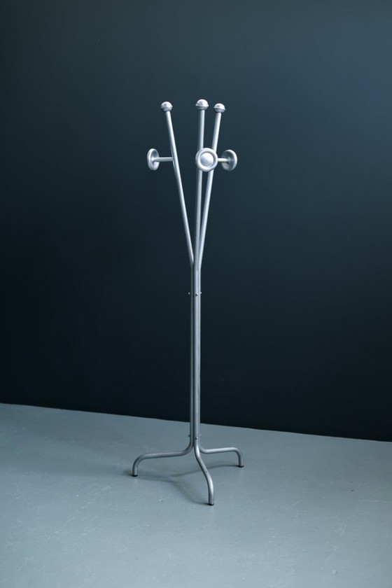 Entdecken Sie den minimalistischen Blickfang im italienischen Eingangsbereich. Diese Garderobe aus Aluminium aus den 1970er Jahren besticht durch ihre industrielle Eleganz und reduziert die Form auf das Wesentliche – rhythmische Linien. Ihr schlankes Dreibeingestell trägt eine Vielzahl eleganter, scheibenförmiger Arme, die an einen stilisierten, silbernen Baum aus einem Traum der Mid-Century-Ära erinnern.