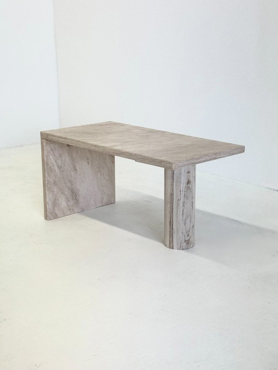 Dieser italienische Marmortisch ist ein elegantes und funktionales Design, das sowohl als Couchtisch als auch als Beistelltisch verwendet werden kann. Die Tischplatte ist aus Palissandro-Marmor gefertigt, einem luxuriösen Material mit subtilen Adern in warmen Farbtönen, die dem Tisch ein raffiniertes Aussehen verleihen. Das innovative Design hat auf einer Seite eine durchgehende Platte, die als Fuß dient, während die andere Seite von einem zylindrischen Fuß getragen wird. Dieses asymmetrische Design macht den Tisch zu einem Highlight, das sich an verschiedene Einrichtungsstile anpasst.
